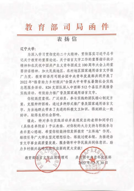 近日,由教育部语言文字应用管理司和共青团中央青年发展部共同开展的2022年“推普助力乡村振兴”全国大中专学生暑期社会实践志愿服务活动圆满结束,“国产一区二区日本在线九州正声”团队获得“优秀团队”荣誉称号。